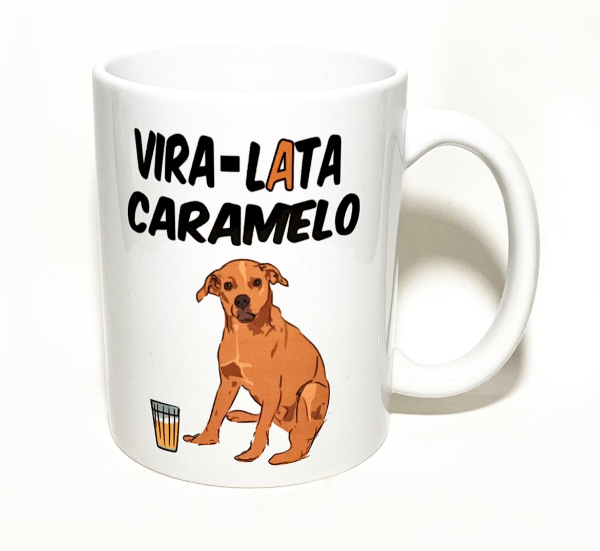 Caneca de cerâmica branca com acabamento brilhoso e estampa autoral centralizada. A ilustração combina um caramelo e um copo de cerveja, trazendo leveza e personalidade para o seu momento de pausa.